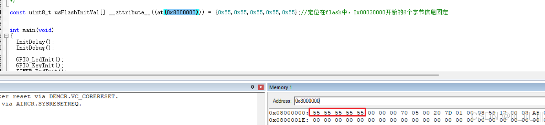 const uint8_t usFlashInitVal[] __attribute__((at(0x08002800))) = {0x55,0x55,0x55,0x55,0x55};//定位在flash中,0x00030000开始的6个字节信息固定 注意7801的地址在8000000之后