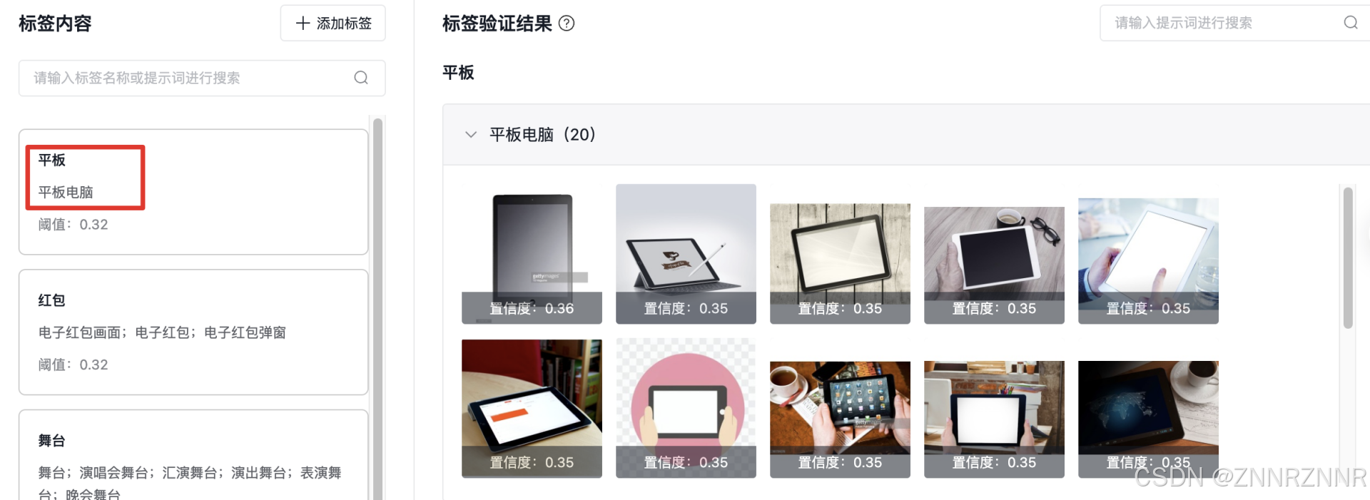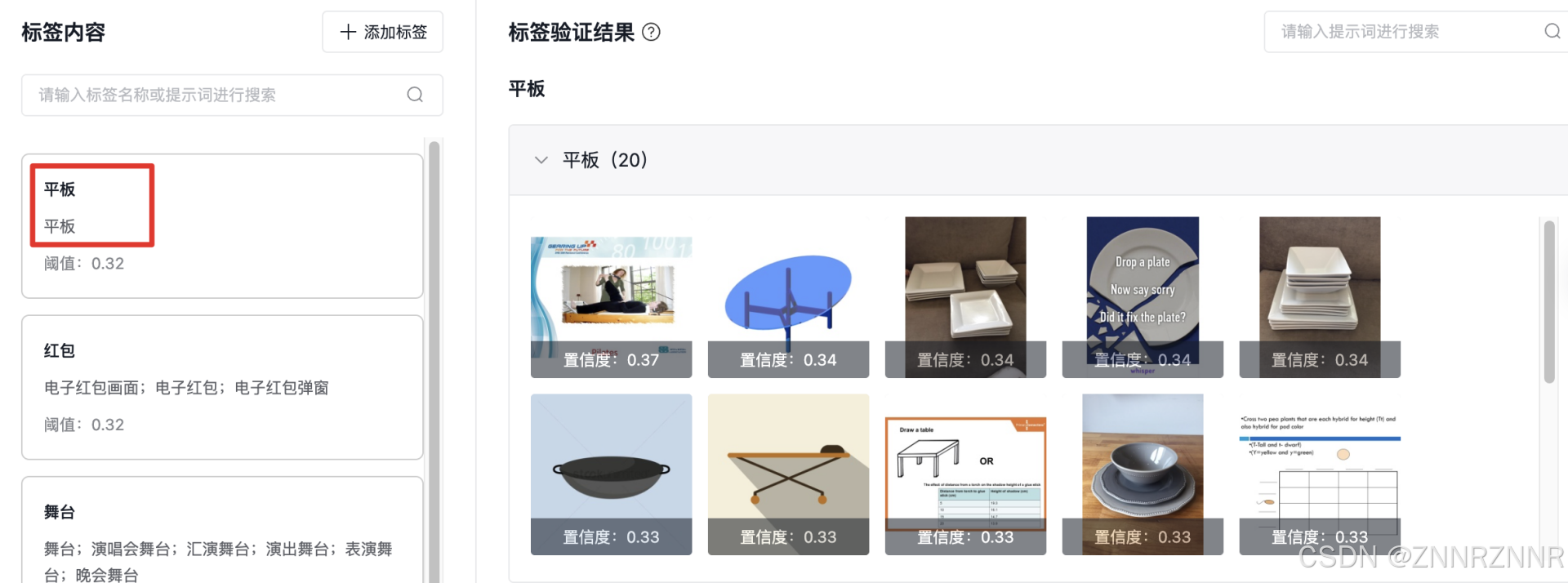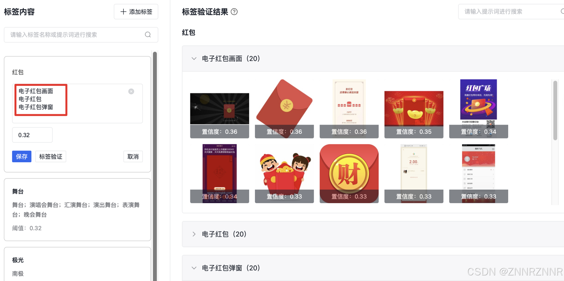 当阈值设定好之后,在“标签验证”时,也只有“置信度”大于阈值的图片,才会被召回,且最多可以召回20张图片。