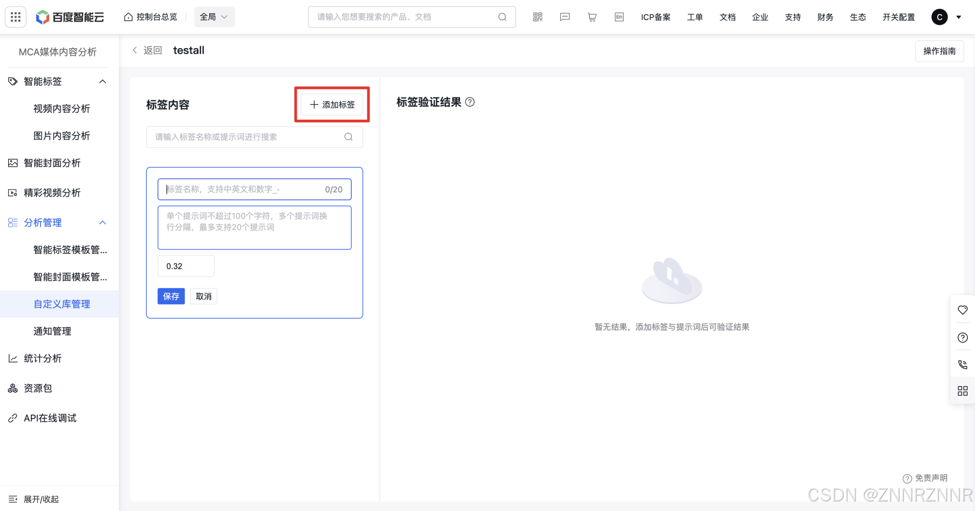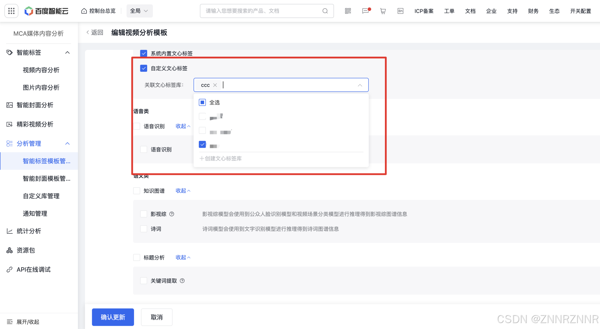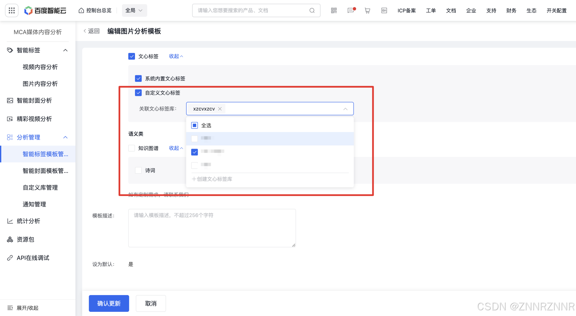编辑好标签和提示词后,可以在视频分析模板、图片分析模板的“自定义文心标签”项下,绑定对应的标签库。