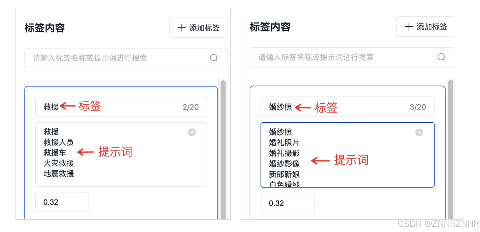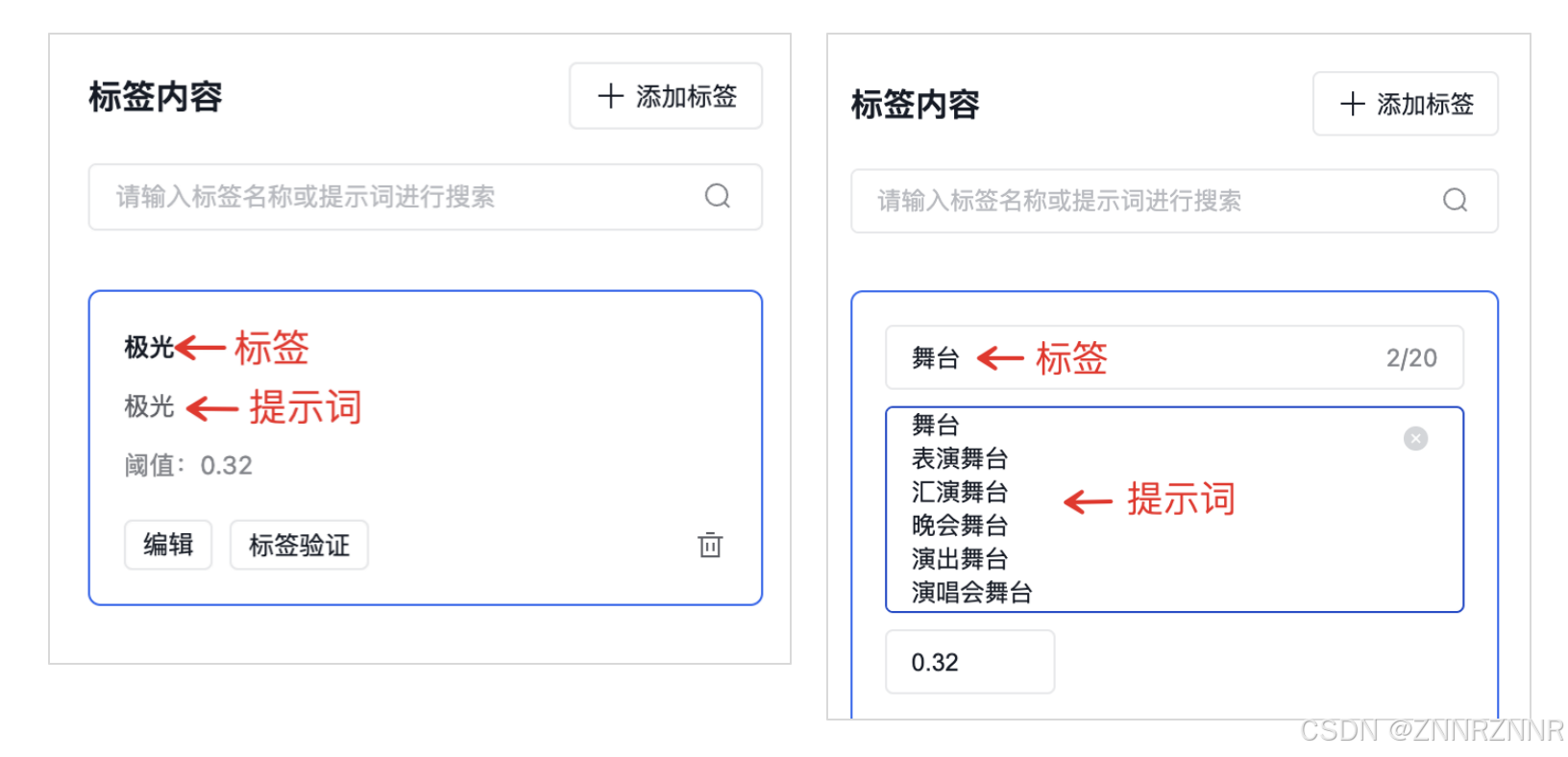 标签是用户期望系统为图片、视频内容打上的标签,提示词是系统打标签的参考依据。