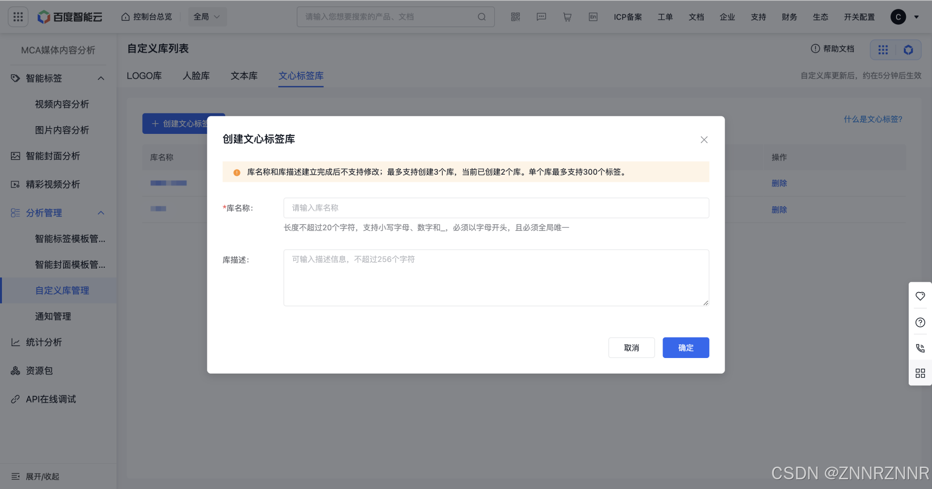 进入自定义库管理>文心标签库页面,点击“创建文心标签库”按钮,创建库。每个用户最多可创建3个库,单个库最多支持300个标签。