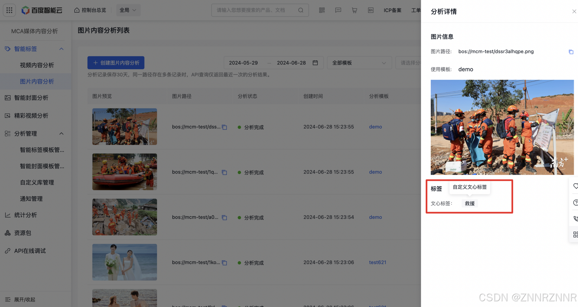 通过API接口或内容分析产品控制台,选择已经绑定好文心标签库的模板,发起“图片内容分析”或“视频内容分析”,验证内容打标结果是否符合预期。如与预期不符,可增加或修改提示词。