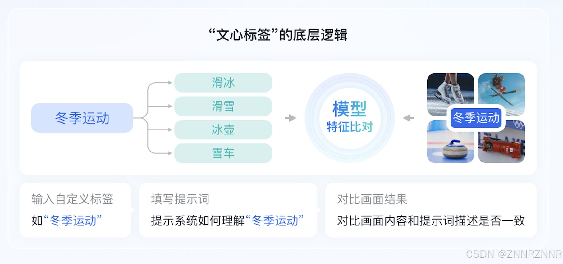 例如,“冬季运动”为标签,“滑冰、滑雪、冰壶、雪车”为提示词。系统在进行内容分析的过程中,如果发现某个图片或视频的画面内容与提示词一致,就会为其打上对应的标签。