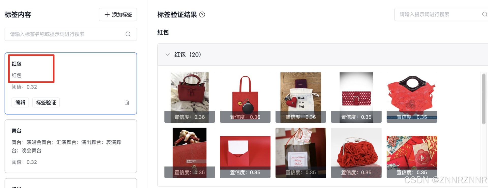 如“红包”这个标签,本意是想召回在线的各类红包营销活动、红包提示,但进行“标签验证”后发现,系统召回了“红色的手提包”。为了避免系统对红包产生歧义、以至在后续使用过程中,给很多图片错误打上“红包”标签,可以将提示词改写为“电子红包画面”“电子红包”“电子红包弹窗”。