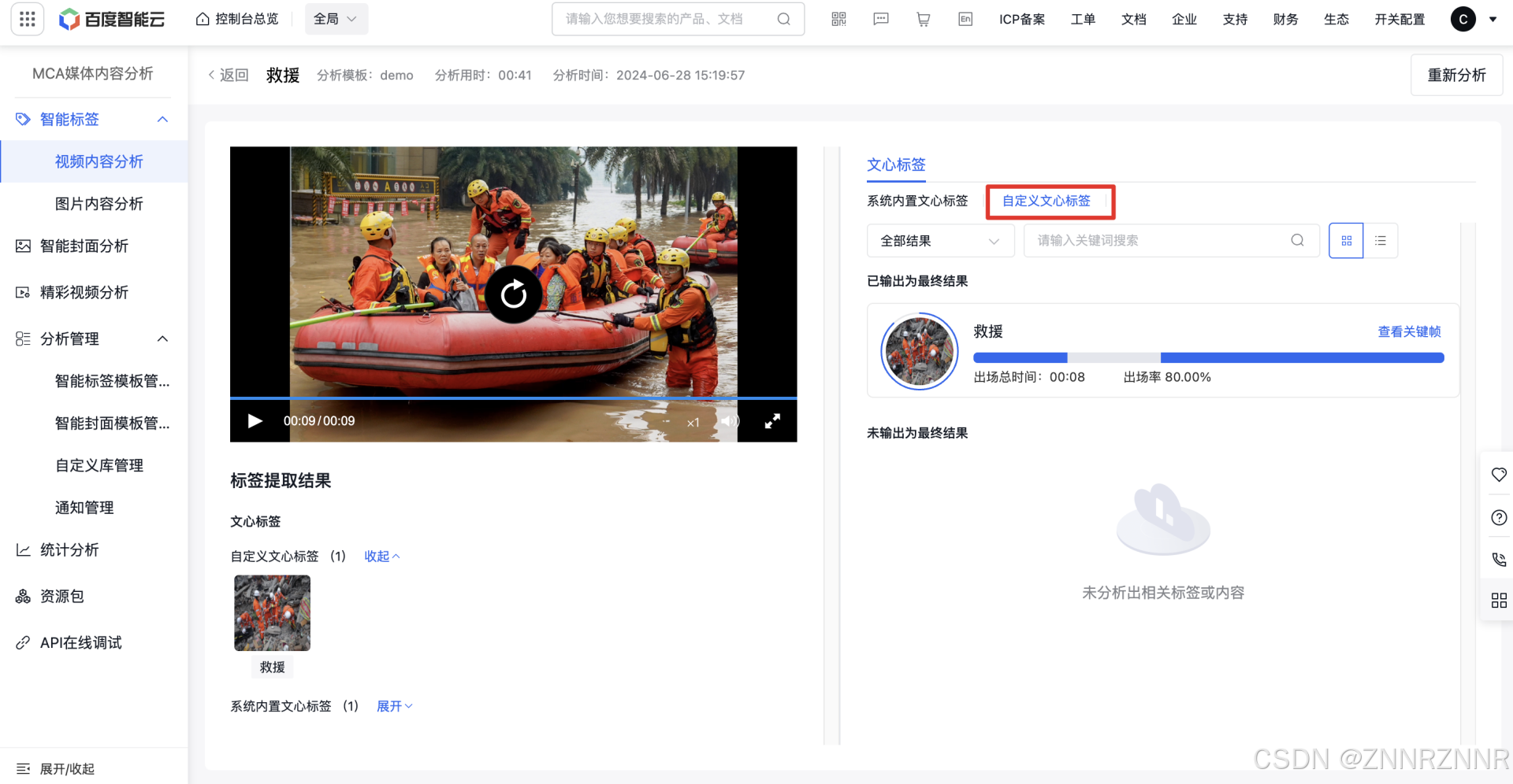 当系统中已有的标签无法满足实际需求时,只需在文心标签库里输入“标签名称+提示词”的文本,系统就能为视频、图片打上对应的标签。这个能力的实现,使用了百度“文心•跨模态大模型”,因此通过这种方式打出的标签,被称为“文心标签”。