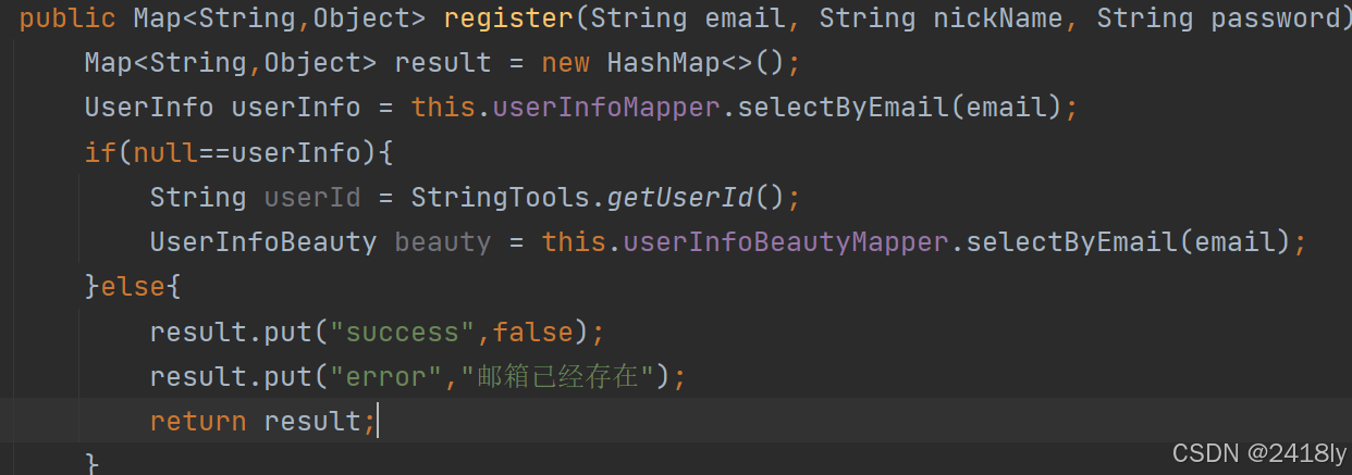 验证码成功后在我们的实现类中,我们先判断邮箱是否重复,不重复我们就继续注册