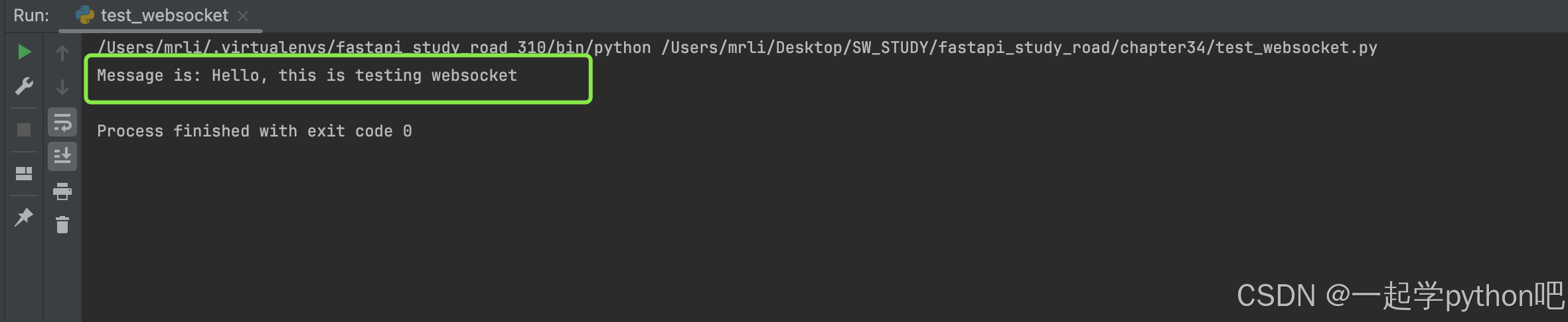 """ 测试websockets """ from fastapi.testclient import TestClient from main import app def test_websocket(): client = TestClient(app) with client.websocket_connect("/items/ws?token=fake-token") as websocket: websocket.send_text("Hello, this is testing websocket") data = websocket.receive_text() print(data) assert str(data) == f"Message is: Hello, this is testing websocket" if __name__ == '__main__': test_websocket() 此时,发现代码不会再报错