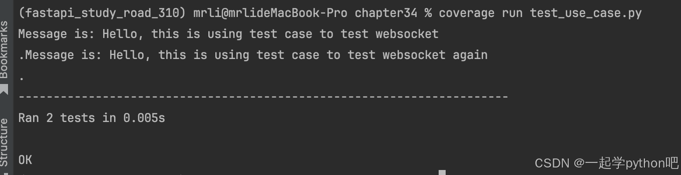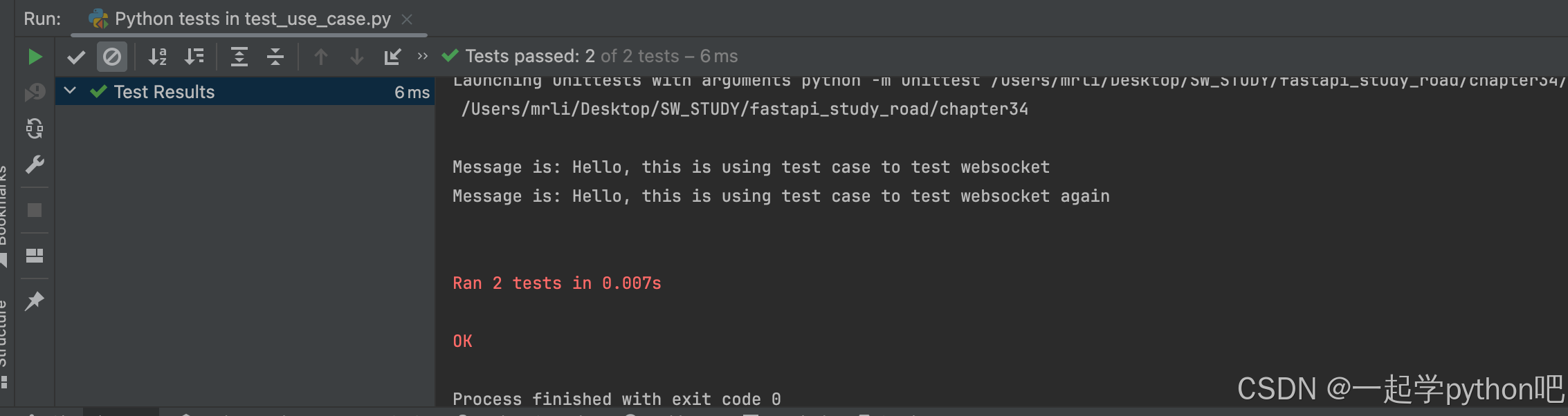 import unittest from fastapi.testclient import TestClient from main import app class FastApiTestWeb(unittest.TestCase): def setUp(self) -> None: self.client = TestClient(app) def tearDown(self) -> None: self.client = None def test_websocket(self): with self.client.websocket_connect("/items/ws?token=fake-token") as websocket: websocket.send_text("Hello, this is using test case to test websocket") data = websocket.receive_text() print(data) assert str(data) == "Message is: Hello, this is using test case to test websocket" def test_websocket_again(self): with self.client.websocket_connect("/items/ws?token=fake-token") as websocket: websocket.send_text("Hello, this is using test case to test websocket again") data = websocket.receive_text() print(data) assert str(data) == "Message is: Hello, this is using test case to test websocket again" if __name__ == '__main__': unittest.main() 这样我们的一个测试用例就更加的完整了。我们执行正常是没有报错的