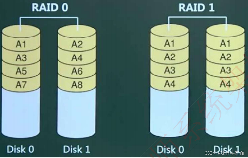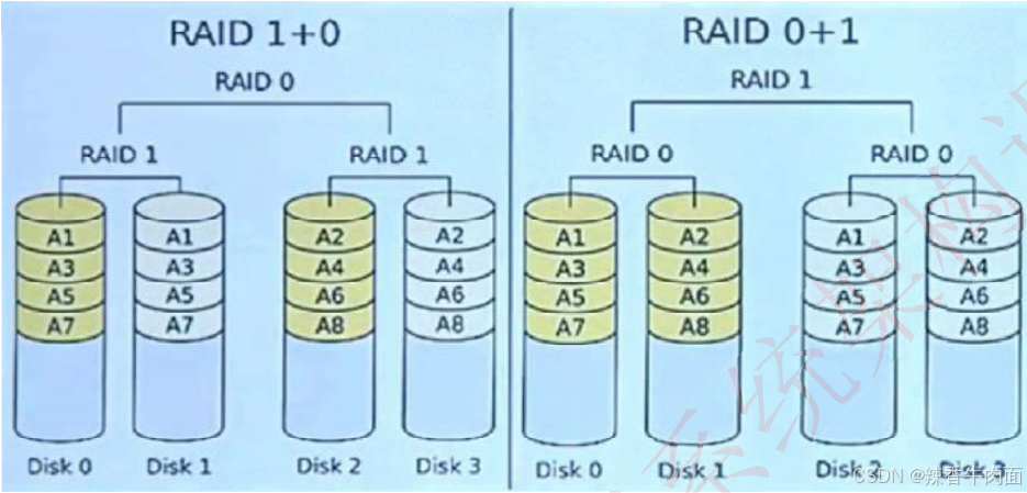 是两个RAID0,若一个磁盘损坏,则当前 RAID0无法工作,即有一半的磁盘无法工作); RAID1+0(是