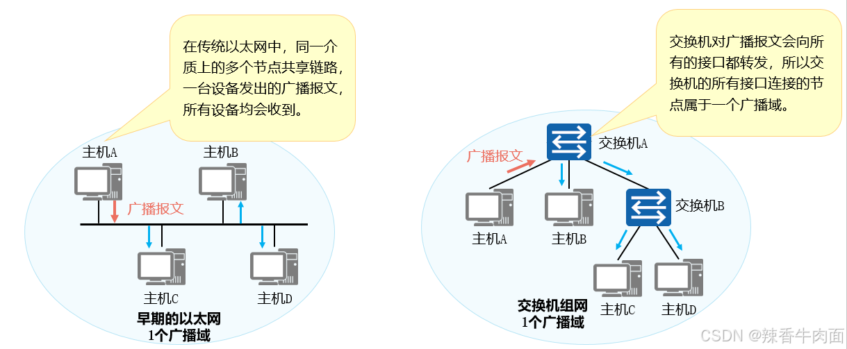 广播报文所能到达网络的整个访问范围称为二层广播域,简称广播域,同一广播域内的主机都能收到广播报文。广播报文一般采用 ARP 协议进行广播。