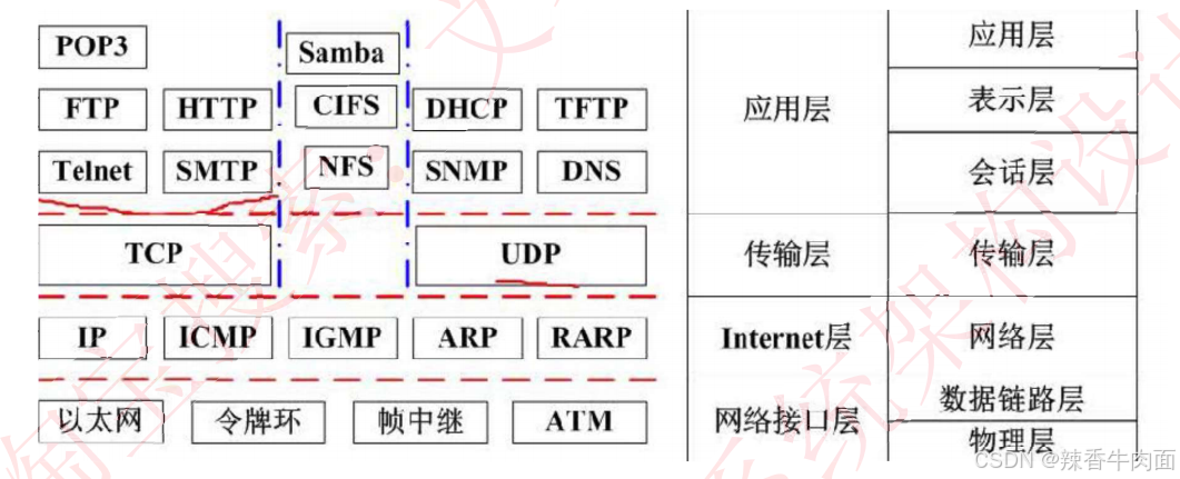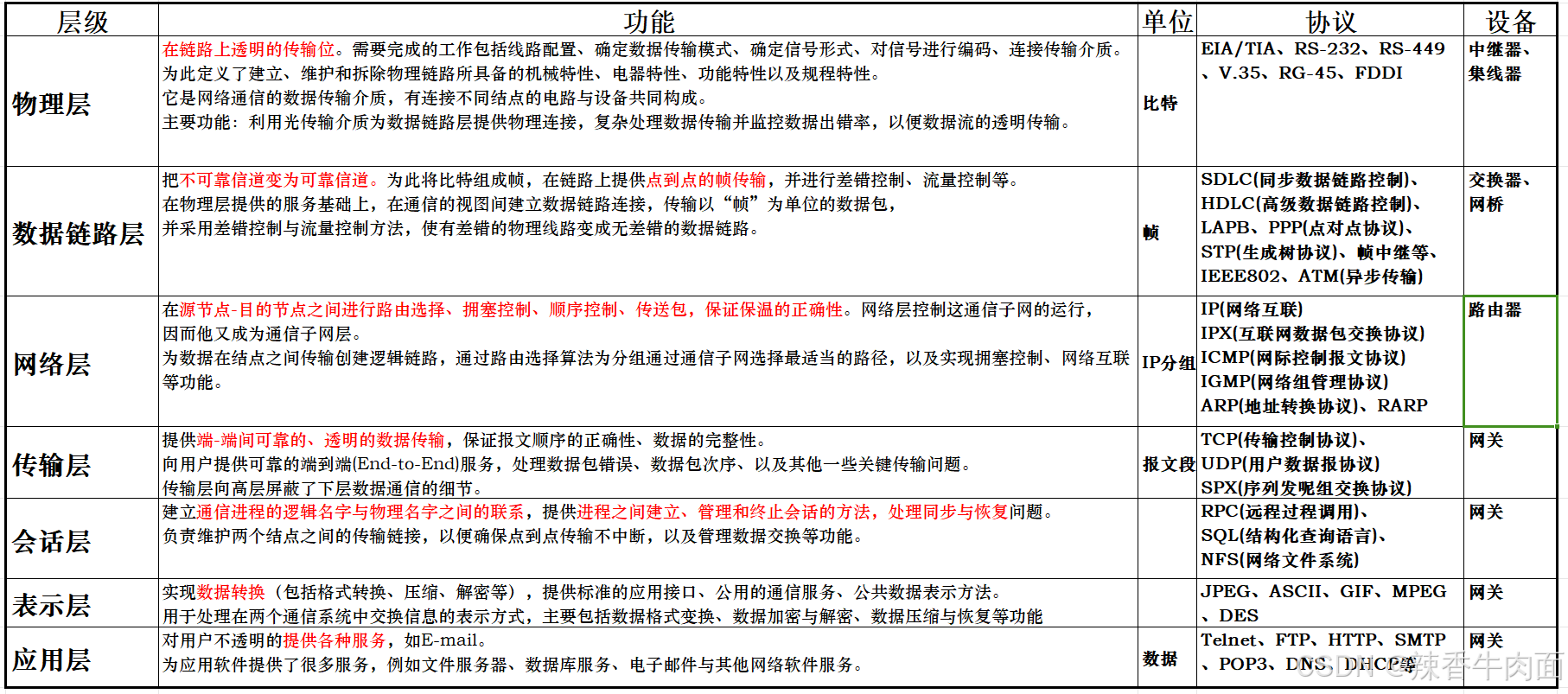应用层数据--->表示层转换、加密、压缩等等--->会话层通信进程间逻辑名字和物理名字转换,建立会话等--->传输层的端到端的传输确定通信进程的端口(不同的进程监听不同端口)--->网络层确定传输的IP地址(哪台电脑,也可能是集群)--->数据链路层确定传输的哪台电脑(MAC地址)--->物理层把数据通过比特位发送过去。