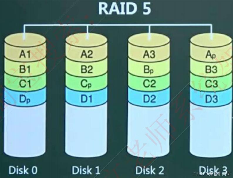 单块磁盘存储奇偶校验信息(可靠性低于 RAID5);