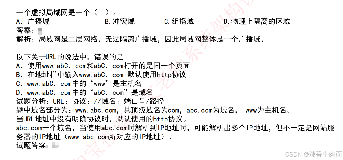 一个虚拟局域网是广播域,局域网是数据链路层,用的是交换机,可以隔离冲突域,但是隔离不了广播域,所以是广播域。 选A。www.abc.com:abc.com是域名,com是顶级域名,www是主机名或者服务,比如FTP、WWW、mail等等。 A是因为也可以mail.abC.com和WWW.abC.com是不一样的 B默认是http,但是现在也有很多浏览器默认是https了