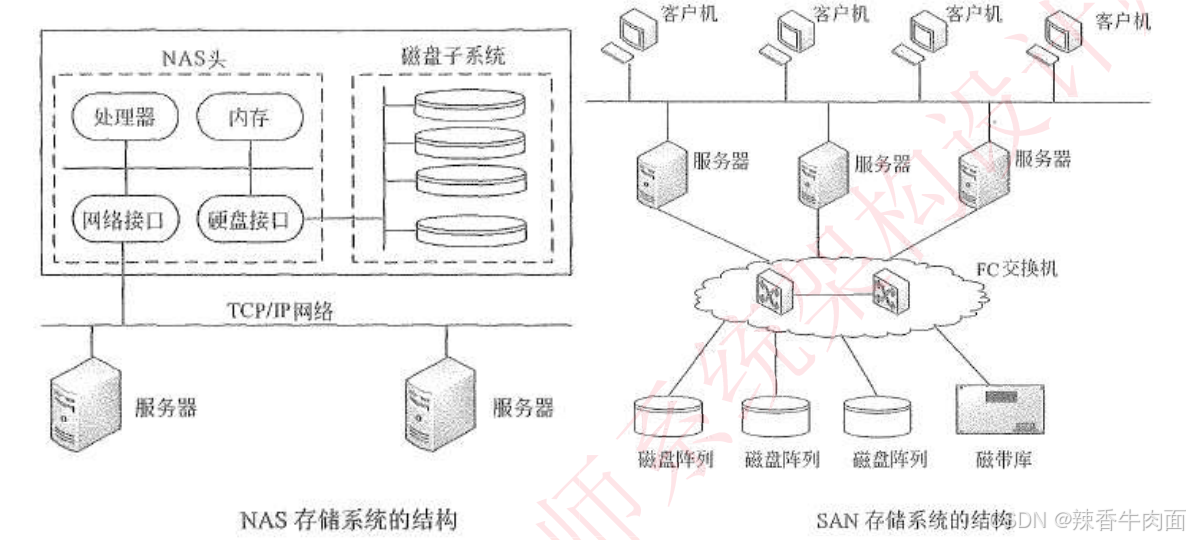 采用块(block)级别存储。SAN是通过专用高速网将一个或多个网络存储设备和服务器连接起来的专用存储系统,其