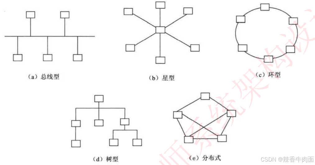 流 动方向固定、效率低扩充难)、树型(总线型的扩充、分级结构)、分布式(任意节点连接、管理难成 本高)