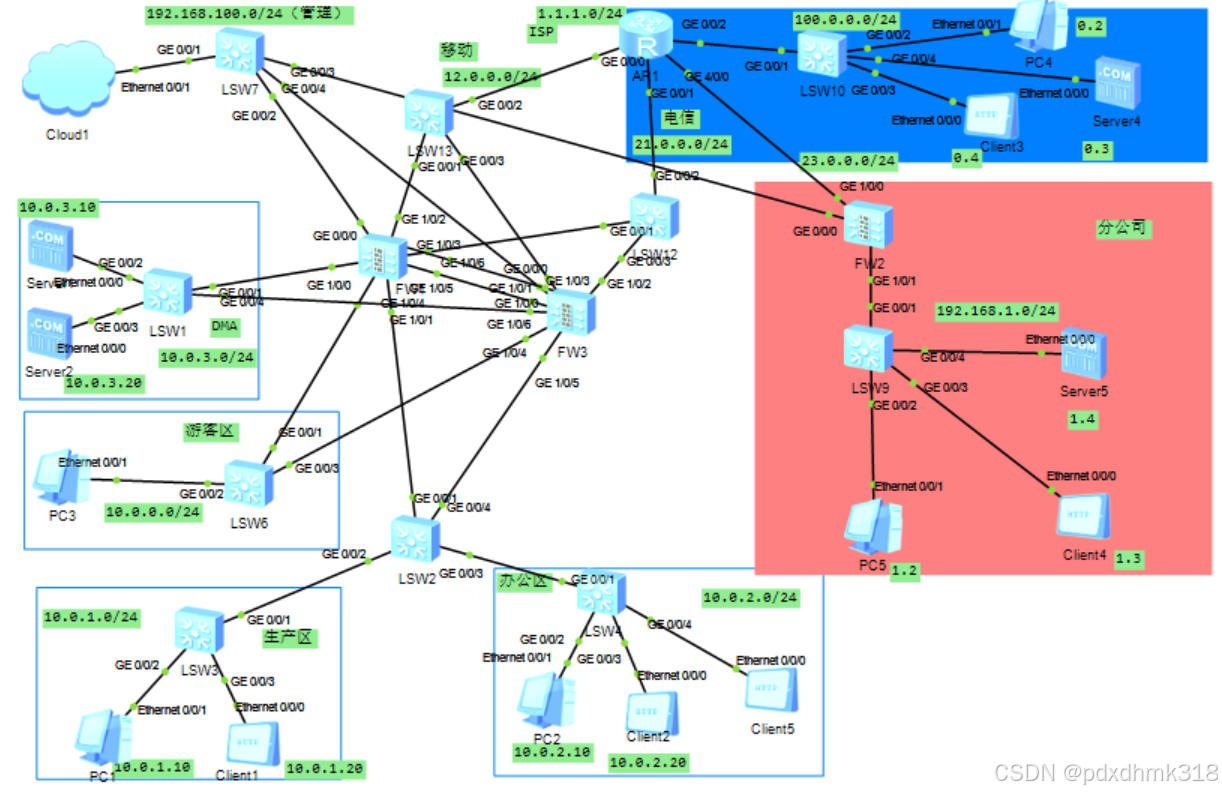 1、FW1和FW3做双机热备,负载分担模式,游客区和DMZ区走FW3,生产区和办公区的流量走FW1