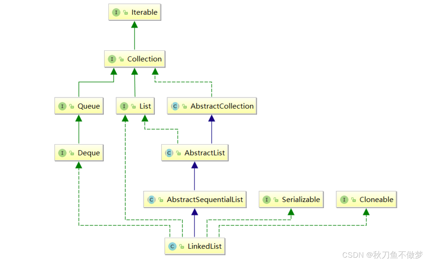 —— 通过上边的解释,我相信读者你已经对LinkedList(双向链表)有了自己的初步认知,那么接下来我们从LinkedList在整个集合框架中与其他类与接口的关系来继续介绍LinkedList(双向链表)