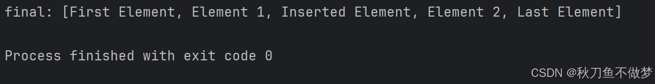 import java.util.LinkedList; public class LinkedListAddExample { public static void main(String[] args) { LinkedList linkedList = new LinkedList<>(); // 在末尾添加元素 linkedList.add("Element 1"); linkedList.add("Element 2"); // 在指定位置插入元素 linkedList.add(1, "Inserted Element"); // 在头部添加元素 linkedList.addFirst("First Element"); // 在尾部添加元素 linkedList.addLast("Last Element"); //打印结果 System.out.println("final: " + linkedList); } }
