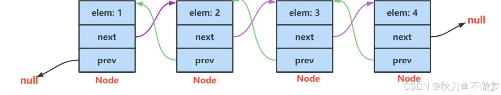 下图很好的展示了什么是通过节点的引用来管理元素的存储和连接以及双向链表的构成:
