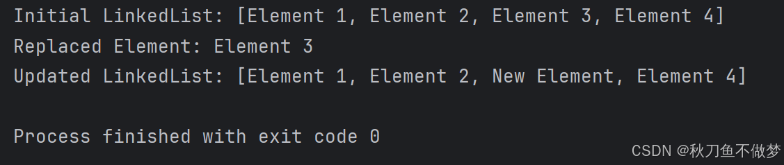 import java.util.LinkedList; public class LinkedListSetExample { public static void main(String[] args) { // 创建一个LinkedList并添加一些元素 LinkedList linkedList = new LinkedList<>(); linkedList.add("Element 1"); linkedList.add("Element 2"); linkedList.add("Element 3"); linkedList.add("Element 4"); // 输出初始的LinkedList System.out.println("Initial LinkedList: " + linkedList); // 使用set方法替换索引为2的元素 String oldElement = linkedList.set(2, "New Element"); // 输出被替换的旧元素 System.out.println("Replaced Element: " + oldElement); // 输出修改后的LinkedList System.out.println("final: " + linkedList); } }