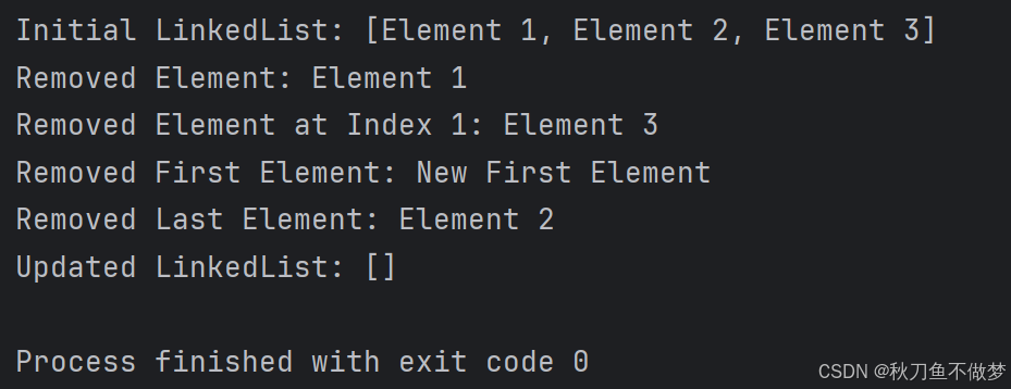import java.util.LinkedList; public class LinkedListRemoveExample { public static void main(String[] args) { LinkedList linkedList = new LinkedList<>(); linkedList.add("Element 1"); linkedList.add("Element 2"); linkedList.add("Element 3"); System.out.println("Initial LinkedList: " + linkedList); // 移除并返回第一个元素 String removedElement = linkedList.remove(); System.out.println("Removed Element: " + removedElement); // 移除指定位置的元素 String removedIndexElement = linkedList.remove(1); System.out.println("Removed Element at Index 1: " + removedIndexElement); // 移除第一个元素 linkedList.addFirst("New First Element"); String removedFirstElement = linkedList.removeFirst(); System.out.println("Removed First Element: " + removedFirstElement); // 移除最后一个元素 String removedLastElement = linkedList.removeLast(); System.out.println("Removed Last Element: " + removedLastElement); //打印结果 System.out.println("final: " + linkedList); } }