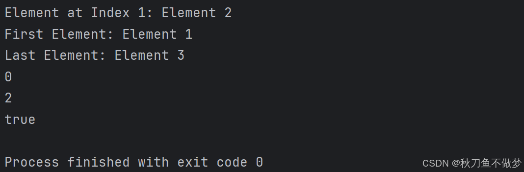 import java.util.LinkedList; public class LinkedListGetExample { public static void main(String[] args) { LinkedList linkedList = new LinkedList<>(); linkedList.add("Element 1"); linkedList.add("Element 2"); linkedList.add("Element 3"); // 获取指定位置的元素 String elementAtIndex = linkedList.get(1); System.out.println("Element at Index 1: " + elementAtIndex); // 获取第一个元素 String firstElement = linkedList.getFirst(); System.out.println("First Element: " + firstElement); // 获取最后一个元素 String lastElement = linkedList.getLast(); System.out.println("Last Element: " + lastElement); // 获取指定对象的索引(从左到右第一个) int index = linkedList.indexOf("Element 1"); System.out.println(index); // 获取指定对象的索引(从右到左第一个) int lastindex = linkedList.lastIndexOf("Element 3"); System.out.println(lastindex); // 是否包含指定元素 boolean contains = linkedList.contains("Element 2"); System.out.println(contains); } }