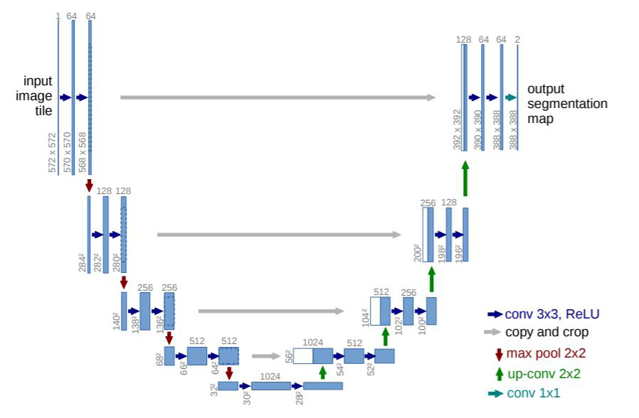 如图的网络架构中,左边从上到下,仍然是一层一层卷积的过程,三层卷积一个block,这个过程也就是图像长宽减小、通道变多的过程。一直到最底下的一层,tensor维度从(572,572,1)变成了(28,28,1024),当然这个过程从代码中打印出来会比较清晰。