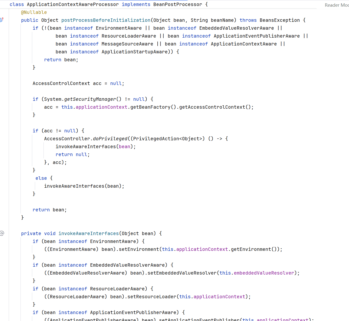 是因为在 Bean 初始化前,先判定有没有实现 Aware 接口,如果实现过了,那么就直接优先调用 Aware 中的方法。如图。
