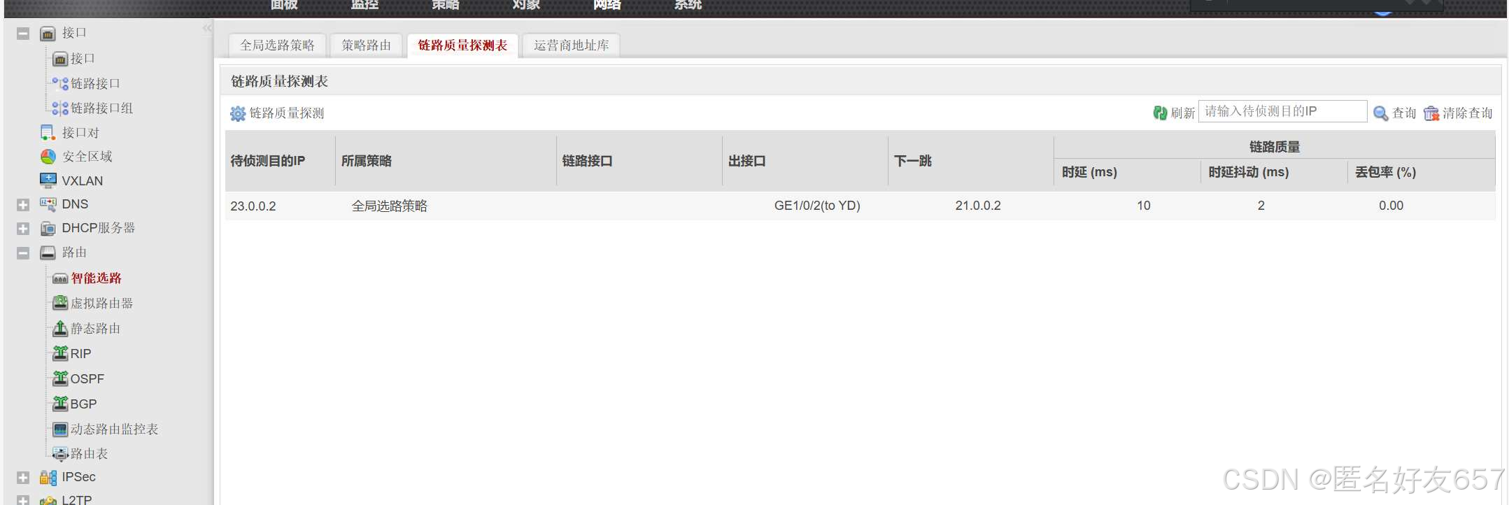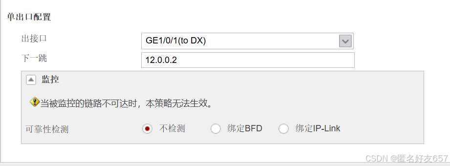 如果没有配置监控,则在匹配上策略路由的流量发现吓一跳不可达,则将直接丢弃数据包,如果可开启了检测,检测发现了目标吓一跳不可达,则将使该策略不生效,则直接不匹配流量,数据包将直接走路由表。