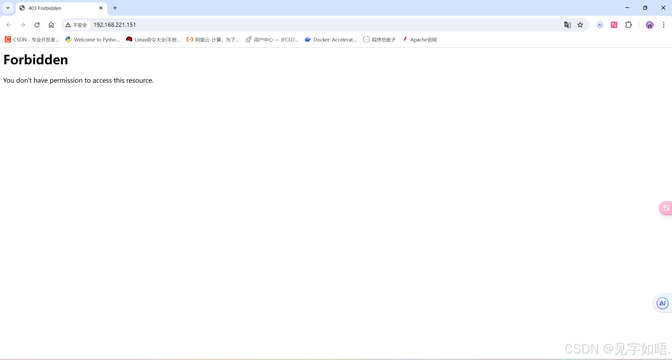 #编辑主配置文件 Require ip 192.168.221.147 #限制只能192.168.221.147主机访问 Require ip 192.168.221.1/24 #限制只能192.168.221网段的主机访问 Require all granted #允许所有主机访问 Require all denied #拒绝所有主机访问 Require local #仅允许本地主机访问 Require [not] host <主机名或域名列表> #允许或拒绝指定主机或域名访问 Require [not] ip #允许或拒绝指定IP地址网络访问 #组合写法 Require all granted Require not ip 192.168.221.0/24 192.168.222.0/24 #以上配置根据需要填写即可 #示例 Require ip 192.168.222.0/24 #只允许192.168.222网段访问 #重启服务,这时我的宿主机就无法访问,我的宿主机网段为192.168.221