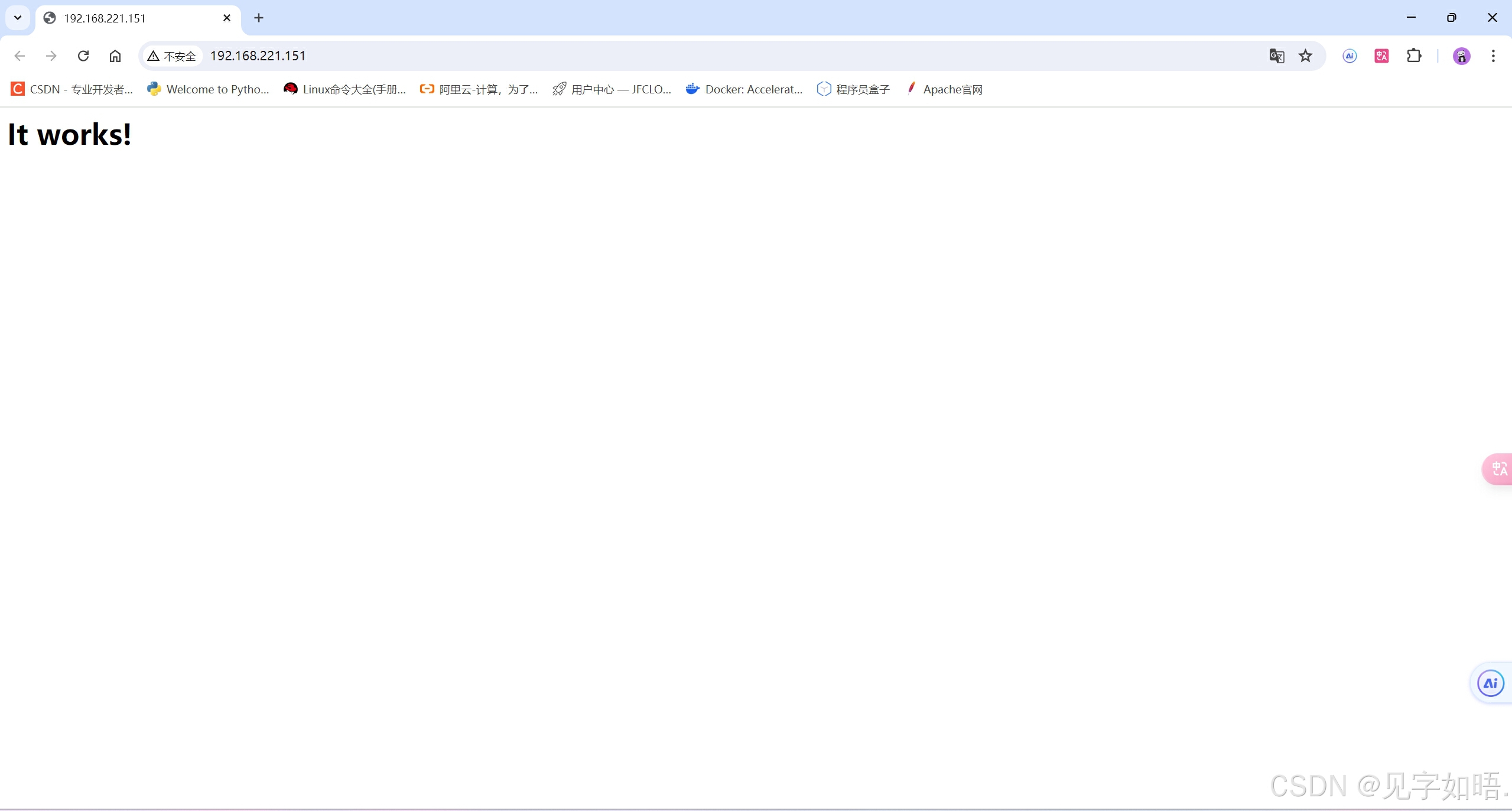 #准备一台Linux虚拟机,IP地址为192.168.221.151 systemctl stop firewalld #关闭防火墙 setenforce 0 #关闭selinux #源代码编译安装 yum -y install gcc gcc-* make #准备编译安装工具 yum -y install apr-util-devel pcre-devel zlib-devel #准备依赖包 tar -zxvf httpd-2.4.59.tar.gz -C /usr/src #解压安装包 cd /usr/src/httpd-2.4.59/ #切换到解压后的目录 #配置安装路径 ./configure --prefix=/usr/local/httpd --enable-so --enable-rewrite --enable-charset-lite --enable-cgi #配置安装路径 make && make install #编译并安装 #使用编译安装,systemctl命令可能会无法使用,运行以下代码 ln -s /usr/local/httpd/bin/* /usr/local/bin/ cat > /lib/systemd/system/httpd.service << 'EOF' [Unit] Description=The Apache HTTP Server After=network.target [Service] Type=forking PIDFile=/usr/local/httpd/logs/httpd.pid ExecStart= /usr/local/bin/apachectl $OPTIONS ExecrReload= /bin/kill -HUP $MAINPID [Install] WantedBy=multi-user.target EOF #启动服务并设置开机自启动 systemctl start httpd systemctl enable httpd 如果是yum安装的话应该会显示Testing123.....页面