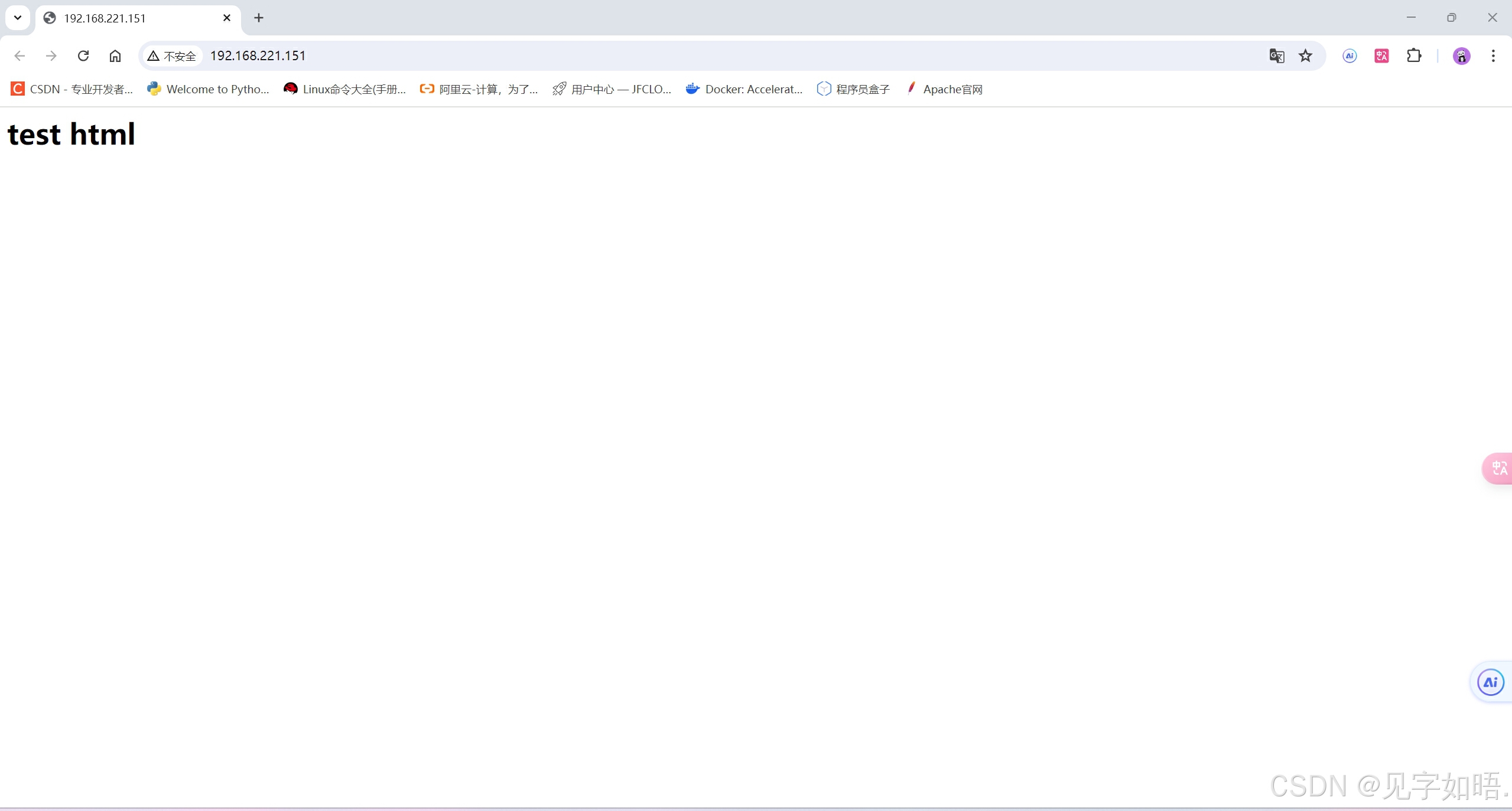 #编辑主配置文件 vi /usr/local//httpd/conf/httpd.conf ServerRoot "/usr/local/httpd" #定义服务器配置文件的根目录 Listen 80 #设置监听的端口为80 ServerName 192.168.221.151 #定义服务器的主机名 DocumentRoot "/usr/local/httpd/htdocs" #定义网站根目录,即HTTP请求访问的默认目录 DirectoryIndex index.html #定义访问网站根目录时默认索引文件 #对特定的目录进行设置 AllowOverride None #设置特殊属性,none表示不设置,all表示允许 Require all granted #允许所有人访问,denied表示拒绝 #在htdocs目录下创建test目录并编写一个网页 echo "test html
