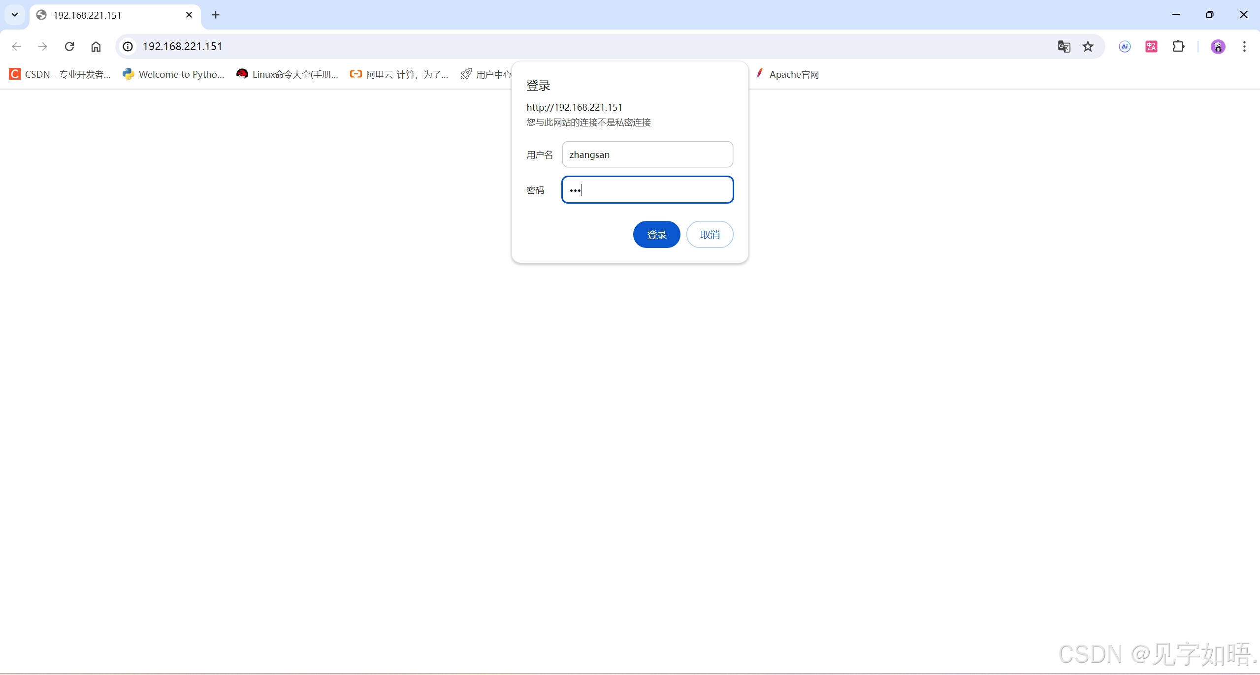 #创建用户,使用httpd/bin/htpasswd cd /usr/local/httpd #创建用户webadmin -c 第一次创建用户时需要创建文件 -m 使用md5加密 bin/htpasswd -c -m /usr/local/httpd/conf/.awspwd zhangsan #再添加一个lisi,这时就不需要使用-c选项 bin/htpasswd -m /usr/local/httpd/conf/.awspwd lisi #编辑主配置文件 AllowOverride None #Require all granted #Require ip 192.168.222.0/24 #这里要注释掉 AuthName "test html" #向用户解释他们正在尝试访问的受保护区域 AuthType Basic #设置认证的类型,Basic 表示基本认证 AuthUserFile /usr/local/httpd/conf/.awspwd #设置用于保存用户账号、密码的认证文件路径 Require valid-user #要求只有认证文件中的合法用户才能访问 #重启服务,访问网页时即可看到需要登录