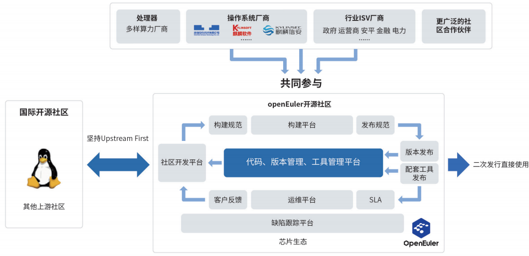 openEuler 社区与上下游生态建立连接,构建多样性的社区合作伙伴和协作模式,共同推进版本演进。
