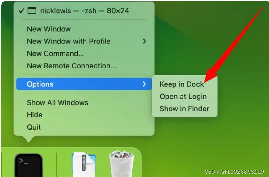 启动终端后,如果你希望以后再次快速访问它,可以选择将其图标保留在程序坞中。只需右键单击程序坞上的终端图标,然后选择“选项>保留在扩展坞”。下次需要运行终端时,只需单击其程序坞图标。