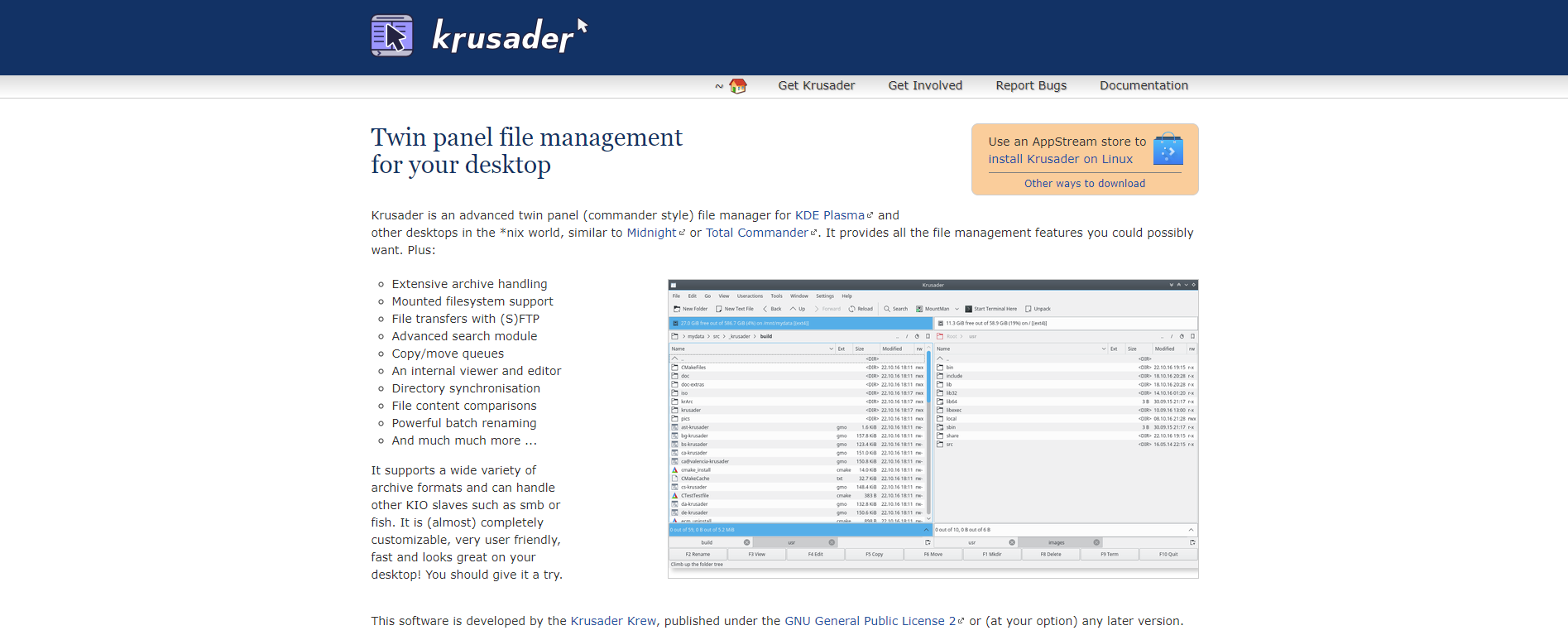 Krusader 是一个功能强大的双面板文件管理器,使用了 KDE 开发工具包(KDE toolkit)。它提供了类似于 Norton Commander 的界面,允许用户在两个面板之间轻松地拖放文件和目录。Krusader 还具有强大的文件操作功能,例如复制、粘贴、重命名、打包和解包等。