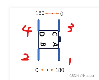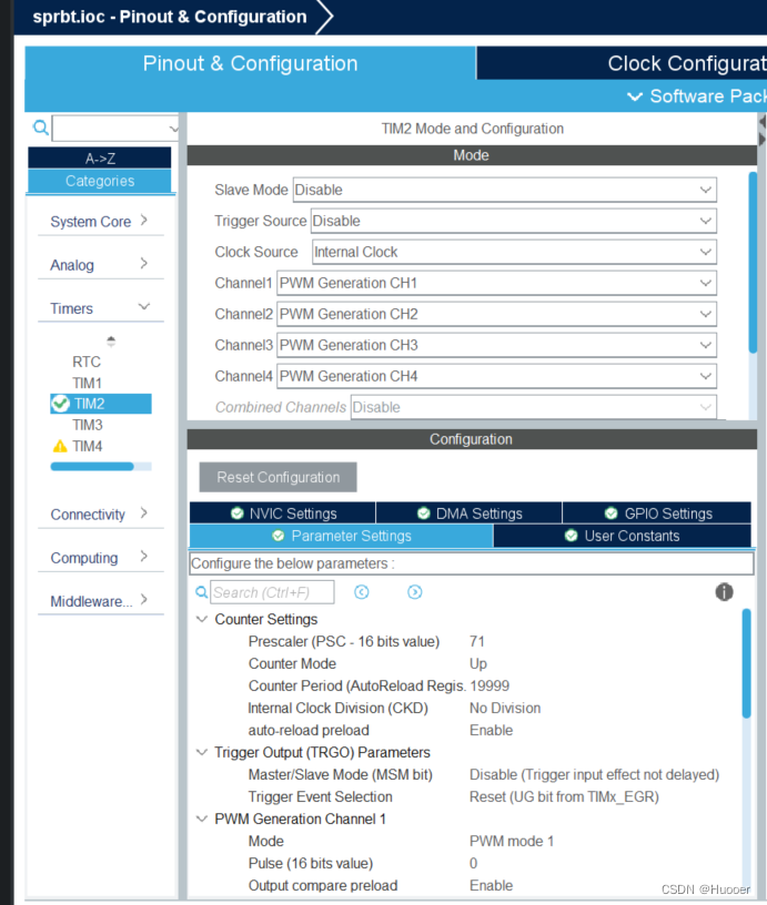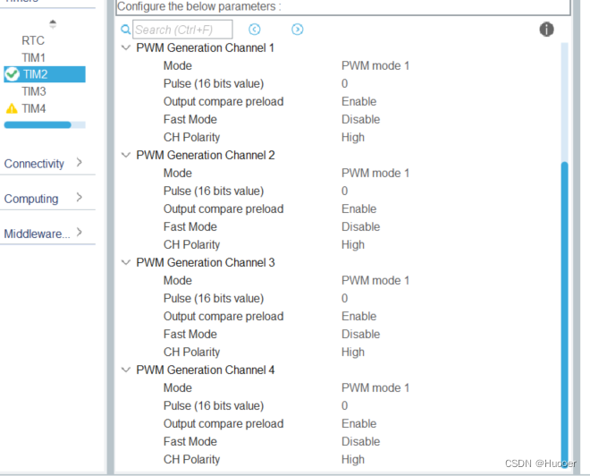 (一个定时器直接开四个PWM通道即可,并关注输出引脚是否正确。根据舵机参数,配置PWM频率为50Hz。通道一为前右脚,通道二为后右脚,通道三为前左脚,通道四为后左脚,脚的位置和角度见文末图,是参考文末大佬的视频的