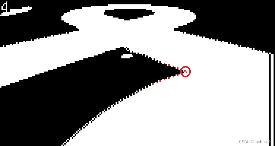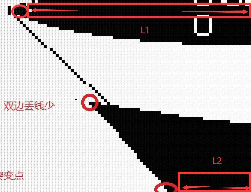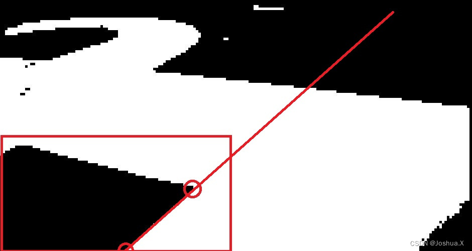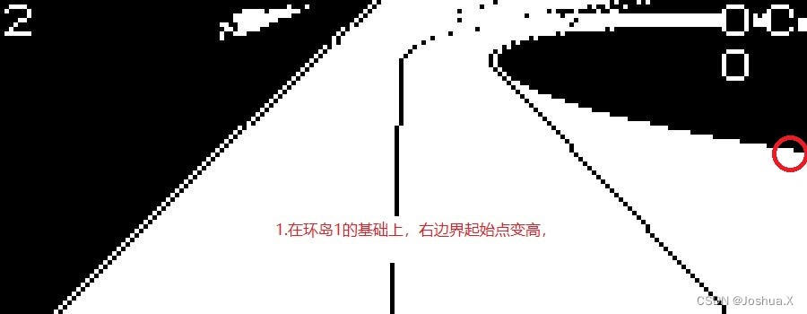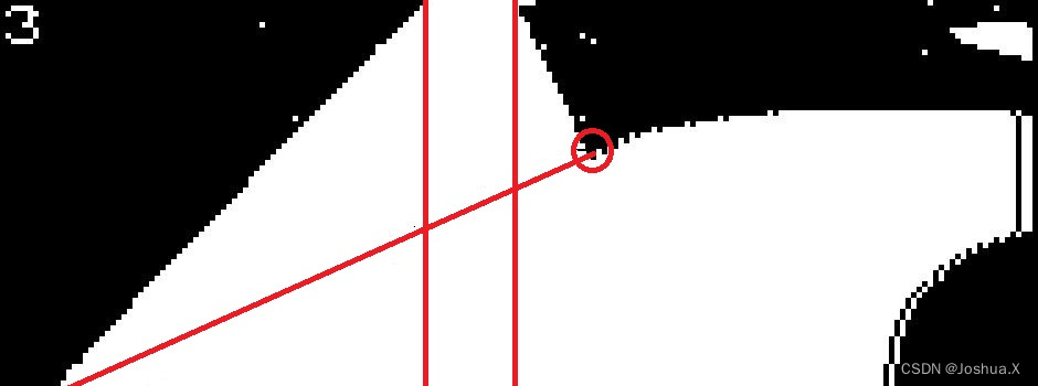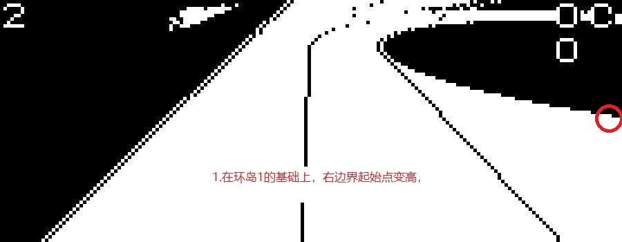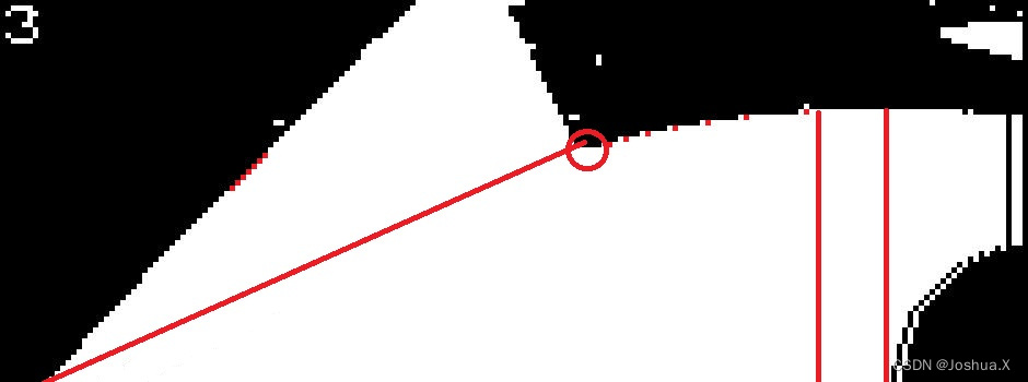 这是环岛3的初期,此时最长白列在左侧,是可以扫到右侧的这个角点,可以连线角点和左下点。