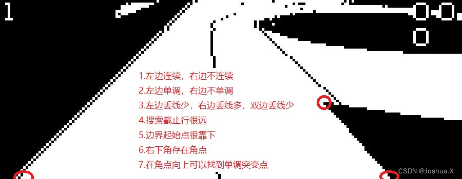 /*-------------------------------------------------------------------------------------------------------------------   @brief     右下角点检测   @param     起始点,终止点   @return    返回角点所在的行数,找不到返回0   Sample     Find_Right_Down_Point(int start,int end);   @note      角点检测阈值可根据实际值更改 -------------------------------------------------------------------------------------------------------------------*/ int Find_Right_Down_Point(int start,int end)//找四个角点,返回值是角点所在的行数 {     int i,t;     int right_down_line=0;     if(Right_Lost_Time>=0.9*MT9V03X_H)//大部分都丢线,没有拐点判断的意义         return right_down_line;     if(start=MT9V03X_H-1-5)//下面5行数据不稳定,不能作为边界点来判断,舍弃         start=MT9V03X_H-1-5;     if(end<=MT9V03X_H-Search_Stop_Line)         end=MT9V03X_H-Search_Stop_Line;     if(end<=5)        end=5;     for(i=start;i>=end;i--)     {         if(right_down_line==0&&//只找第一个符合条件的点            abs(Right_Line[i]-Right_Line[i+1])<=5&&//角点的阈值可以更改            abs(Right_Line[i+1]-Right_Line[i+2])<=5&&              abs(Right_Line[i+2]-Right_Line[i+3])<=5&&               (Right_Line[i]-Right_Line[i-2])<=-5&&               (Right_Line[i]-Right_Line[i-3])<=-10&&               (Right_Line[i]-Right_Line[i-4])<=-10)         {             right_down_line=i;//获取行数即可             break;         }     }     return right_down_line; } 参考下图,左边界是近乎一条直线,相邻任意两行边界的差值都很小,我们称之为“连续”的。