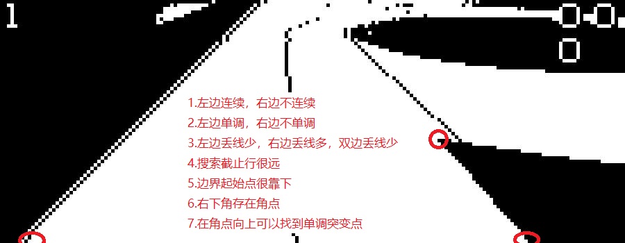 连线原则和状态1一样,这样就做到了边线位置与角点无关,只与单调点位置有关,即使角点判断失误,仍可以流畅前进。