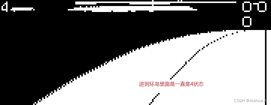 else if(Island_State==3)//下面已经出现大弧线,且上方出现角点         {             if(k!=0)//已经找到点了,画一条死线             {                 K_Draw_Line(k,30,MT9V03X_H-1,0);                 Longest_White_Column();//刷新最长白列             }             else//还在找点             {                 Right_Up_Guai[0]=Find_Right_Up_Point(40,10);//找右上拐点                 Right_Up_Guai[1]=Right_Line[Right_Up_Guai[0]];                 if(Right_Up_Guai[0]<10)//角点位置不对,退出环岛                 {                     Island_State=0;                     Right_Island_Flag=0;                 }                 if(k==0&&(15<=Right_Up_Guai[0]&&Right_Up_Guai[0]<50)&&(70=60))//只依靠陀螺仪积分             {                 k=0;//斜率清零                 Island_State=4;                 Longest_White_Column();//最长白列             }         } 进到3状态直利用圆弧半边补线。