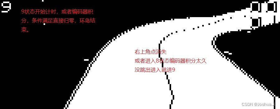 以上三点满足任意一点,都可自动进入9状态,基本认为环岛结束。顺便将相关变量清零,等待下一次使用。