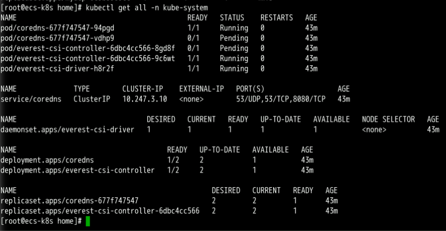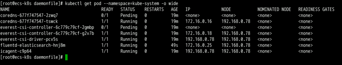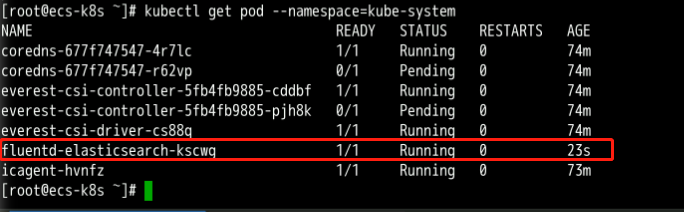 (4)查看创建的DaemonSet。此处, 需要在命令行中通过--namespace=kube-system指定namespace kube-system 。若不指定,则只 返回默认命名空间 default中的资源。实验中只有一个Node节点,所以运行的fluentd也只有1个。