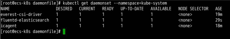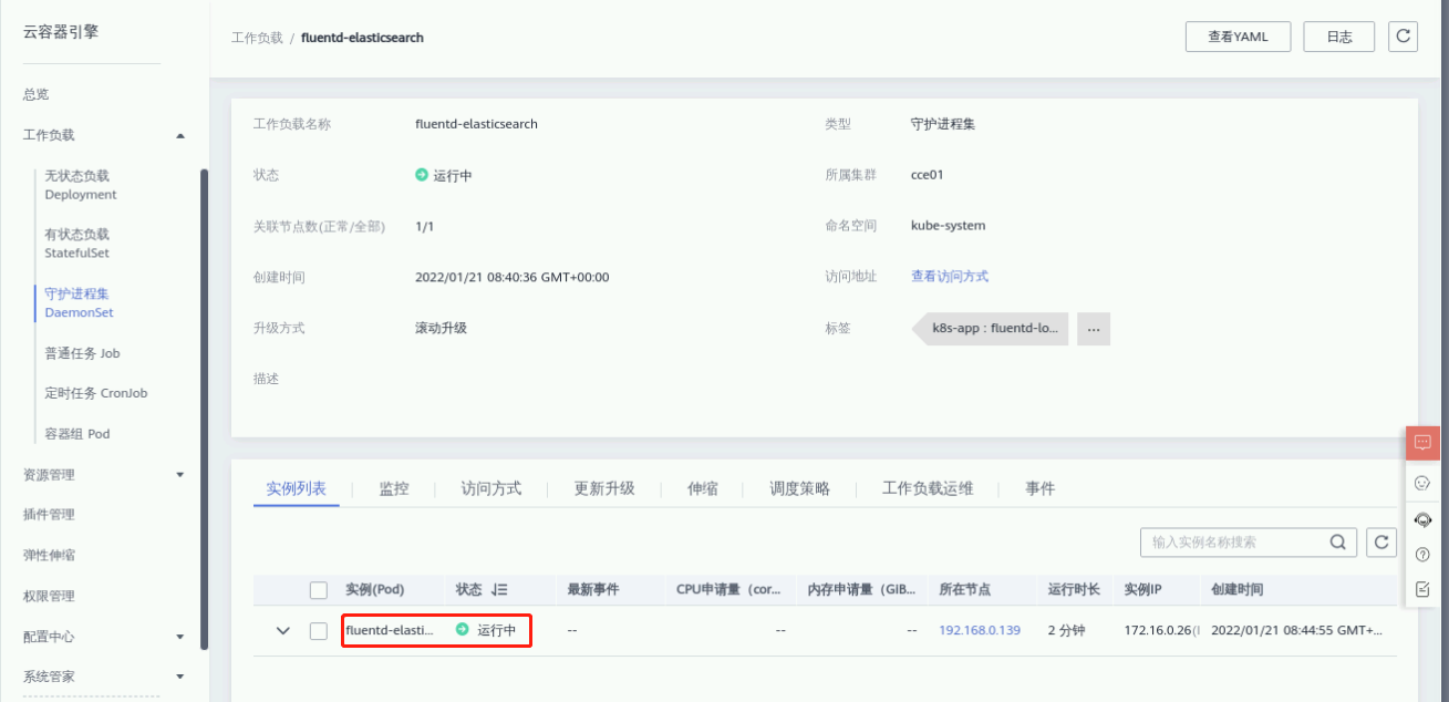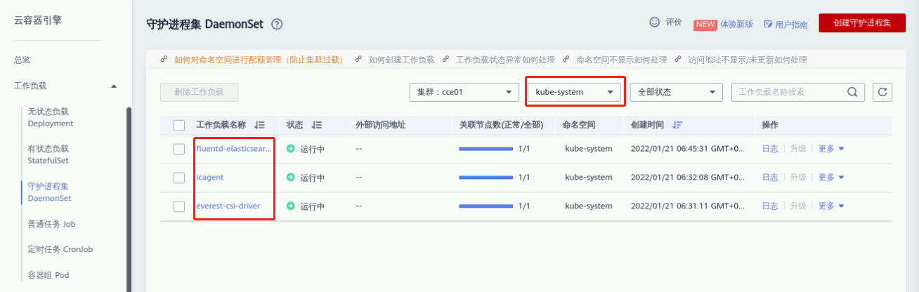 (6)在CCE控制台中,可以查看守护进程集DaemonSet。因为上面步骤创建DaemonSet指定了命名空间,所以命名空间选择kube-system。