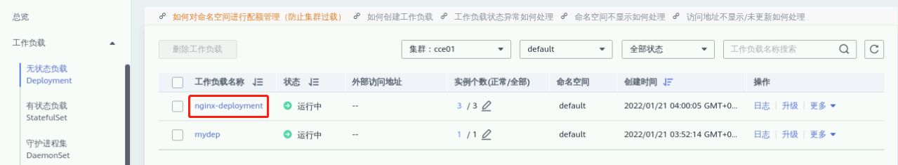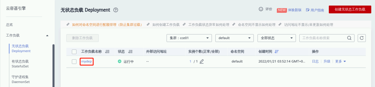 (4)通过CCE控制台查看部署。点击控制台中的工作负载—>无状态负载,可以看到创建的工作负载mydep。