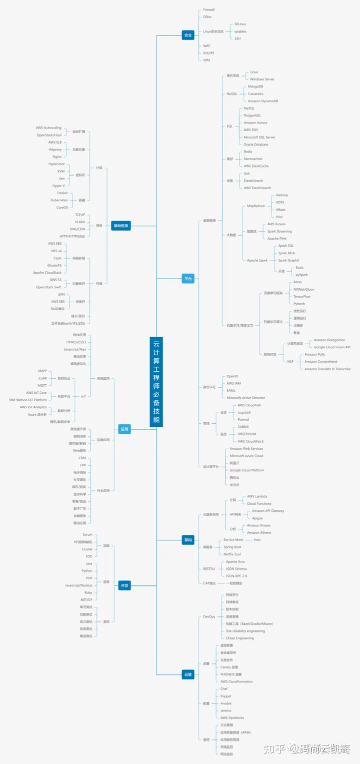 大家好!我是凯哥,今天给大家分享一下云计算学习路线图。这是我按照自己最开始学习云计算的时候的学习路线,并且结合自己从业多年所涉及的知识精心总结的云计算的思维导图。这是凯哥精心总结的,花费了不少精力哦,希望对你有所帮助吧。图中难免有遗漏,大家可以在评论区补足。