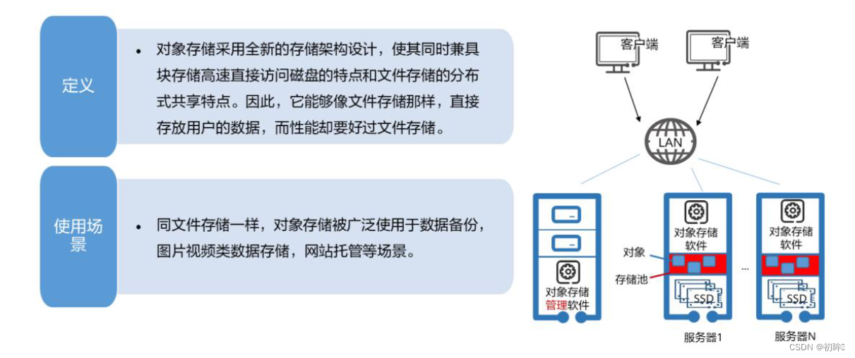 - 随着互联网的兴起,许多互联网应用需要通过终端设备由公网访问数据,这时支持HTTP/HTTPS协议的对象存储就开始大规模使用了。对象存储支持应用端通过API调用的方式存取数据,并且采用分布式的架构设计,具备大容量、高可靠的特点。