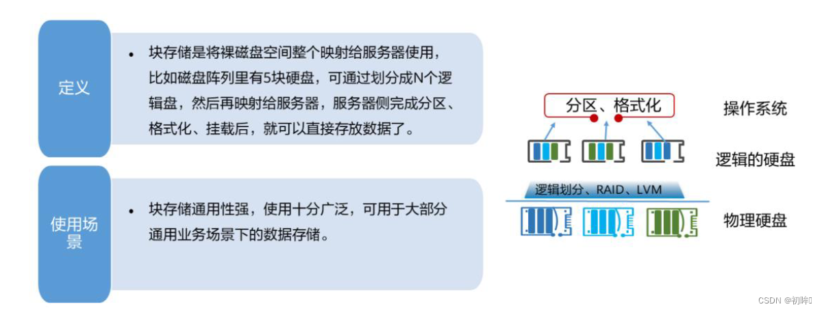 - 最初的服务器是计算存储合一的,使用服务器本地存储存放数据,这就是块存储的始祖,通过服务器内部总线连接磁盘,可以达到很低的时延,但是服务器可以承载的磁盘数量有限,在容量、带宽以及可靠性上有所欠缺。随着IT的发展,数据越来越多,对数据可靠性的要求越来越高,就有了计算、存储分离的需求,这时就有了存储阵列。传统的磁盘阵列采用控制器+磁盘框的架构,控制器采用双机头或者多机头设计,可靠性更高,通过扩展磁盘框,存储容量相比服务器本地磁盘,有了成百上干倍的提高独立地通过FC交换机或者IP交换机与服务器相连,这就是现代的块存储。