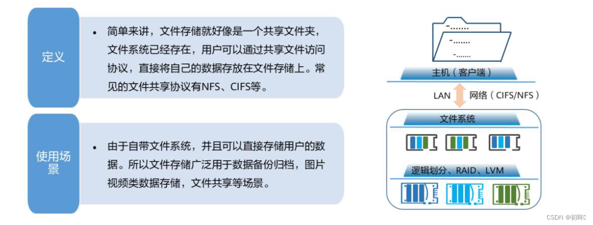 - 随着IT系统的进一步发展,企业内的协同办公诉求出现,需要将同一个目录/文件夹共享给多个主机访问,这时便出现了共享文件系统,将目录/文件夹共享给多个主机访问,这就是共享文件存储。文件存储还是在一个数据中心/机房内共享数据。