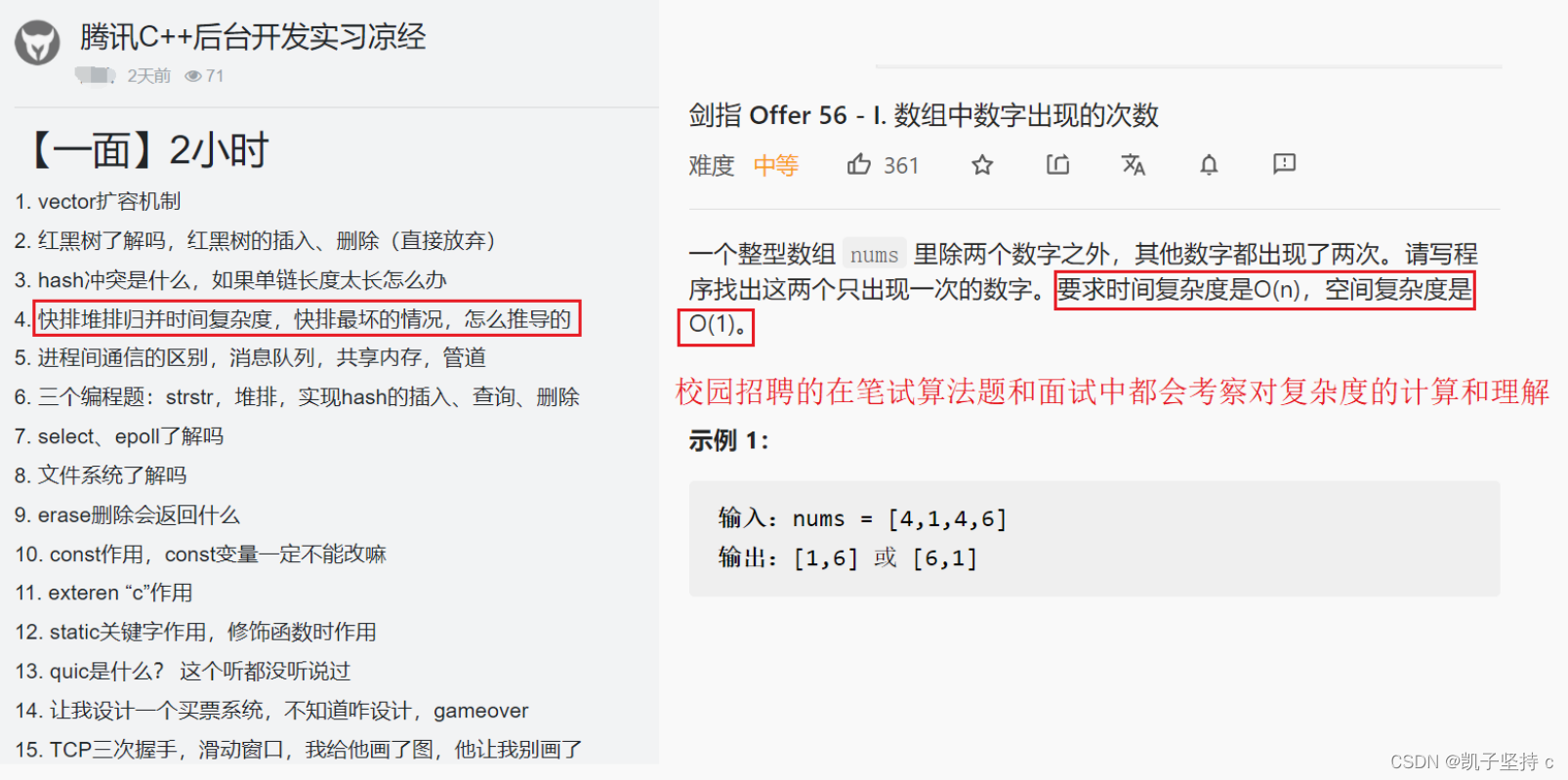 // 计算BubbleSort的空间复杂度? void BubbleSort(int* a, int n) { assert(a); for (size_t end = n; end > 0; --end) { int exchange = 0; for (size_t i = 1; i < end; ++i) { if (a[i - 1] > a[i]) { Swap(&a[i - 1], &a[i]); exchange = 1; } } if (exchange == 0) break; } } /* size_t end = n int exchange = 0 size_t i = 1 三个变量 因为这里的3是常数,那么我们就用1将3代替 那么空间复杂度就是O(1) 循环走了N次,重复利用的是一个空间 */ // 计算Fibonacci的空间复杂度? long long* Fibonacci(size_t n) { if (n == 0) return NULL; long long* fibArray = (long long*)malloc((n + 1) * sizeof(long long)); fibArray[0] = 0; fibArray[1] = 1; for (int i = 2; i <= n; ++i) { fibArray[i] = fibArray[i - 1] + fibArray[i - 2]; } return fibArray; } /* size_t n fibArray fibArray[0] = 0; fibArray[1] = 1; i 这里是5个变量,但是那里有一个malloc,开辟了一个N+1个元素的数组,有n+1个 所以总共是N+6个,但是随着N的增大,6对结果的影响不大 所以这里的空间复杂度就是O(N) 大多数情况之下我们遇到的空间复杂度都是O(1) 因为变量都是常数个 */ 这里就不同了,因为我们使用malloc开辟了一个n+1个元素的空间,原本的变量就有5个,所以总共的变量就是N+6,但是6对结果的影响不大,所以这个题的空间复杂度就是O(N)